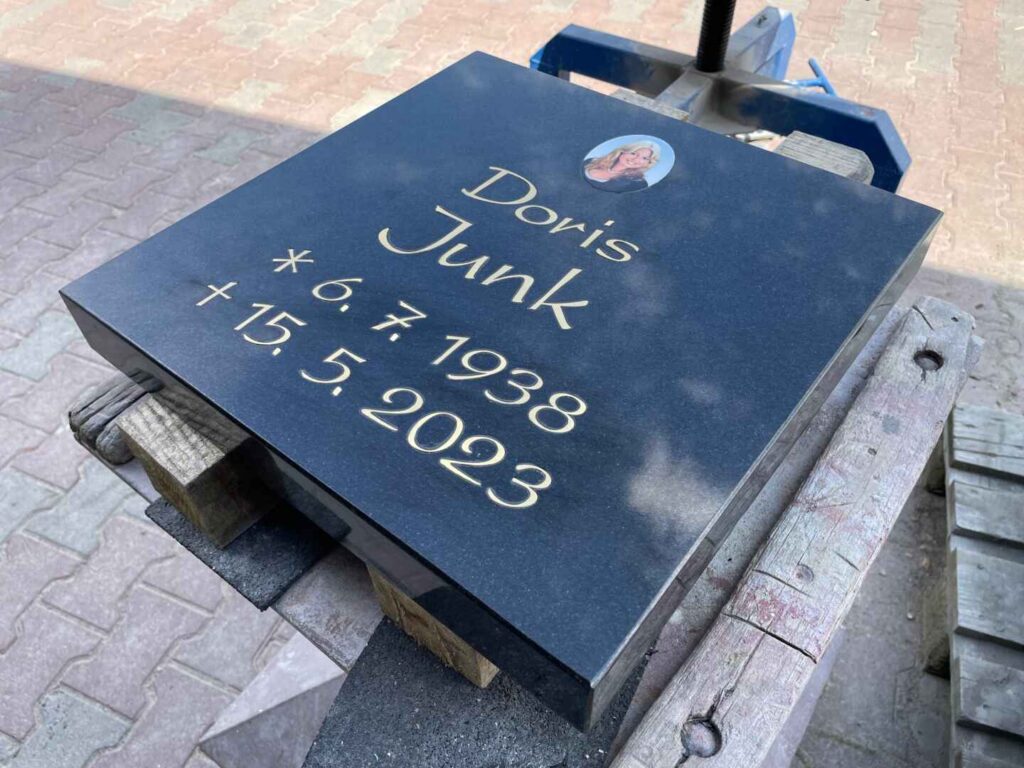 Nach der Vorbereitung der Vertiefung wird die Intarsie eingelegt und ausgerichtet. Dank der präzisen Fertigung passt sie bündig in den Stein. Die Oberfläche schließt sauber ab und ergibt ein hochwertiges, dauerhaftes Erscheinungsbild.
