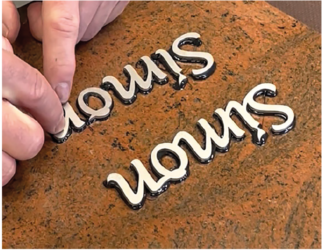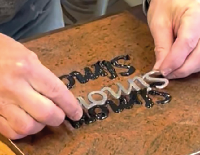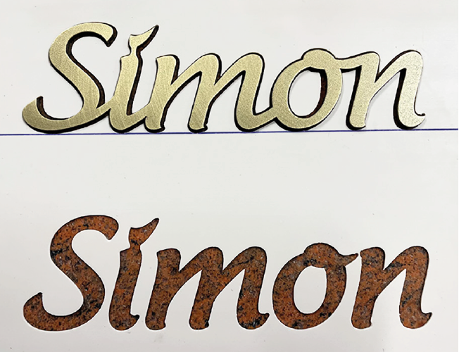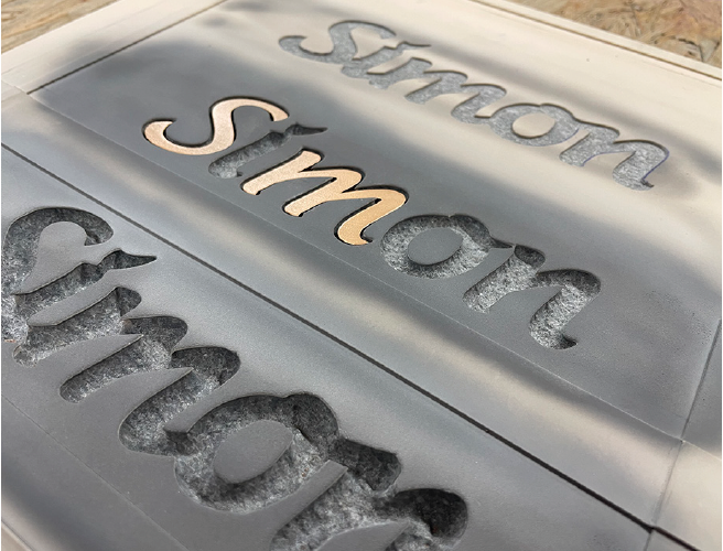 Überzeugen Sie sich selbst von den Original-Metallintarsien von Plein! Wir senden Ihnen gerne ein Testpaket zu, mit dem Sie unseren bekannten Schriftzug „Simon“ in eine Musterplatte einlegen können.