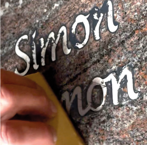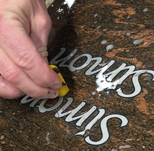 Benetzen Sie anschließend die Granitplatte, das Werkzeug und die Hände großzügig mit lösungsmittelfreiem Glättmittel und versenken Sie die Intrarsienschrift mit dem Kunststoffrakel bündig im Stein.