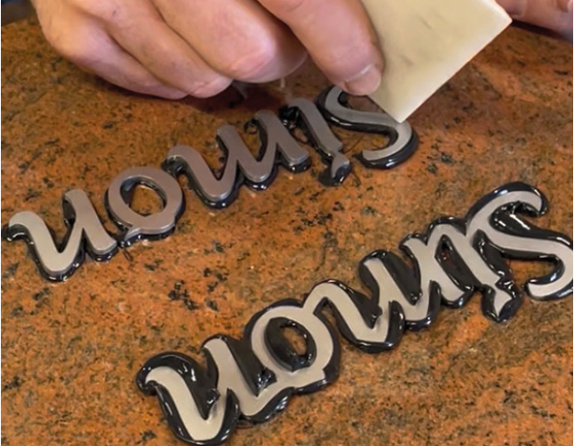 Nun wird die ausgestrahlte Schrift großzügig mit einem elastischen Kleber auf MS-Polymerbasis ausgespritzt.