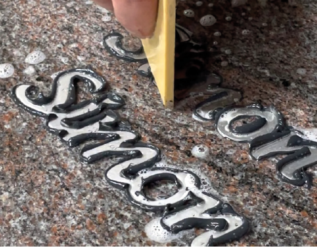 Den restlichen Polymerkleber können Sie mit einem Fugenglätter vorsichtig von der Intarsienschrift und der Granitplatte entfernen. Verwenden Sie auch hierzu reichlich Glättmittel.
