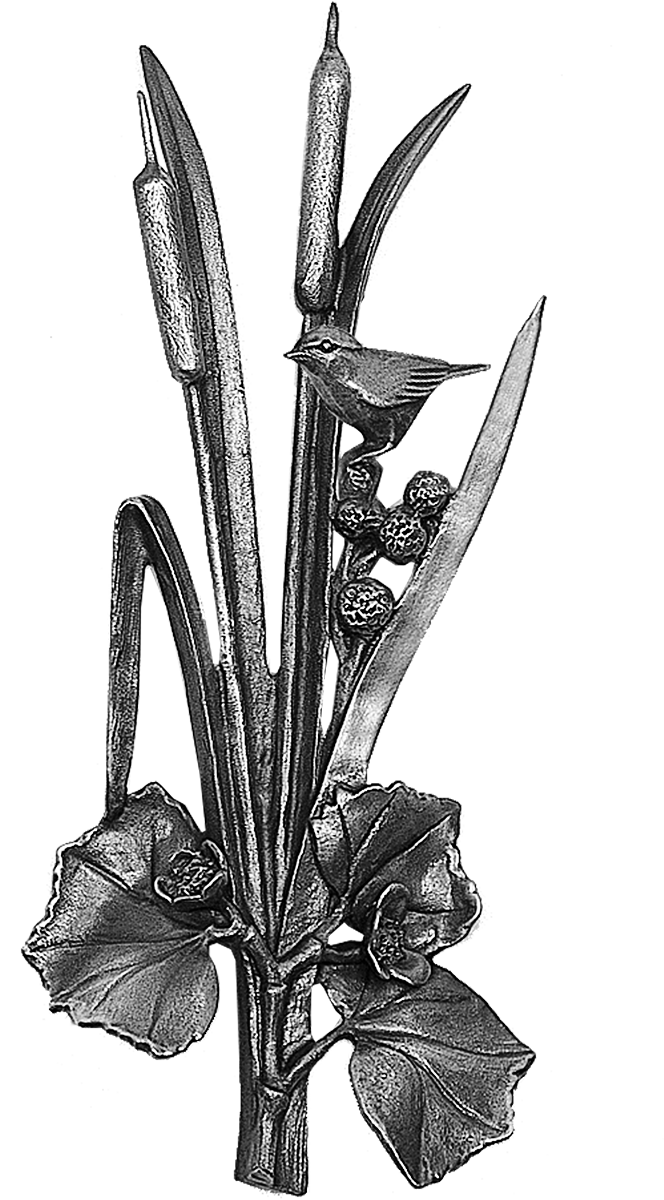 Rohrkolben mit Sumpfdotterblume und Vogel